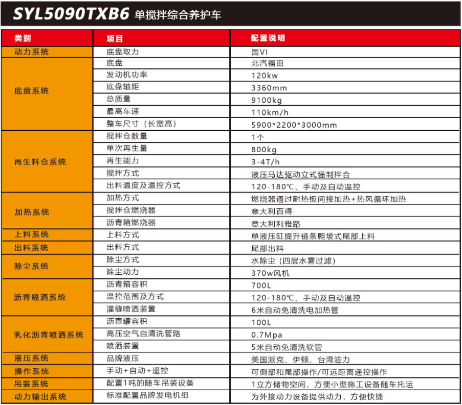 SYL5090TXB6 單攪拌綜合養(yǎng)護(hù)車(chē)是一款集現(xiàn)場(chǎng)生產(chǎn)新瀝青混合料、瀝青路面冷料、 舊料、銑刨料 100%現(xiàn)場(chǎng)加熱再生利用 ,熱瀝青灑布、裂紋跟蹤灌縫、乳化瀝青噴灑、為其他裝置提供電力和液壓動(dòng)力等多種功能于一體的瀝青路面熱再生綜合養(yǎng)護(hù)車(chē)??蓪?shí)現(xiàn)多 場(chǎng)合、多路面的各種類(lèi)養(yǎng)護(hù)作業(yè) ,養(yǎng)護(hù)修補(bǔ)費(fèi)用低 ,作業(yè)快捷 ,高效率、節(jié)能環(huán)保性能突 出等特點(diǎn)。適用于市政、? 國(guó)省道路、鄉(xiāng)村公路、廠區(qū)、園區(qū)等狹窄區(qū)域?yàn)r青路面小型養(yǎng)護(hù)修補(bǔ)施工。